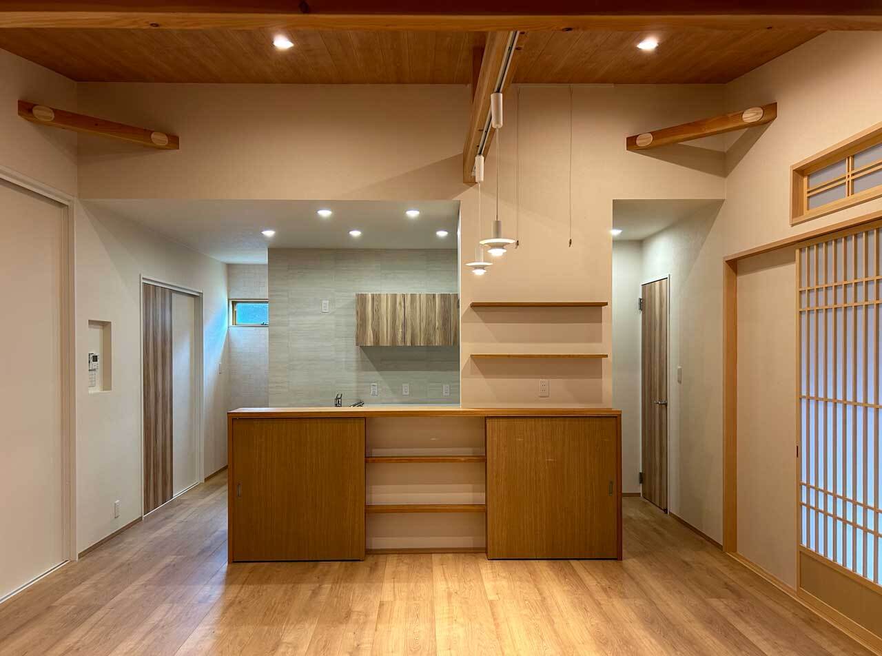 キッチンををLDKの中心に設置した回遊性のある間取りです。背面収納の扉を建具デザインと合わせ、統一した見え方になってます。